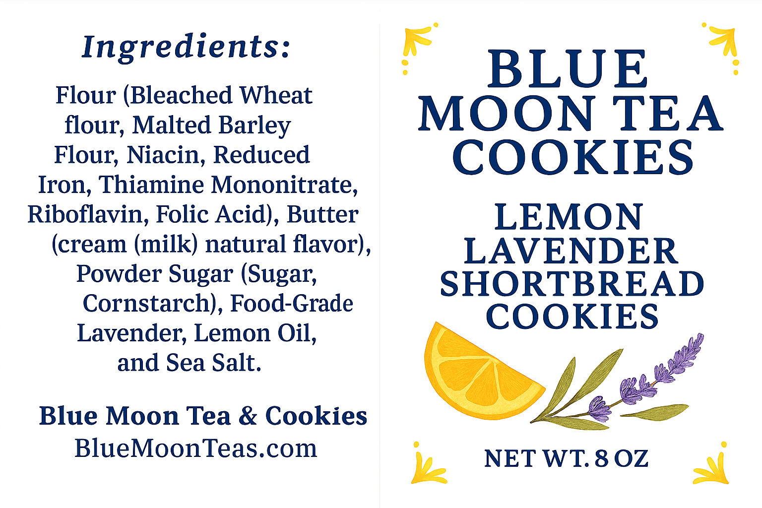 Ingredients: Flour (Bleached Wheat flour, Malted Barley Flour, Niacin, Reduced Iron, Thiamine, Mononitrate, Riboflavin, Folic Acid), Butter (cream, (milk) natural flavor), Powder Sugar ( Sugar, Cornstarch), Food-Grade Lavender, Lemon Oil, and Sea Salt.